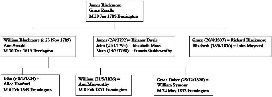 The microfiche copy of the registers for Burrington is extremely difficult to read and so it was not possible to determine earlier generations before James Blackmore. However, there are suggestions via the IGI that he was born in South Molton. Further research is required to ascertain this and previous generations.