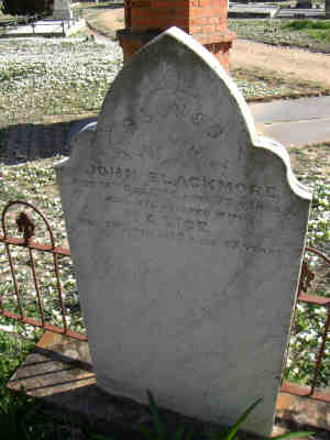 births, deaths & marriages from Digger - Federation Index. Victoria 1889-1901 Surname: BLACKMORE Given Names: Jno Event: D Sex: Spouse Surname/Father: Blackmore Wm Spouse Gvn Names/Mother: Ann UNKNOWN Age: 73 Age Code: Birth Place: Death Place: Maldon Year: 1900 Reg. Number: 13577 (he was actually 76)